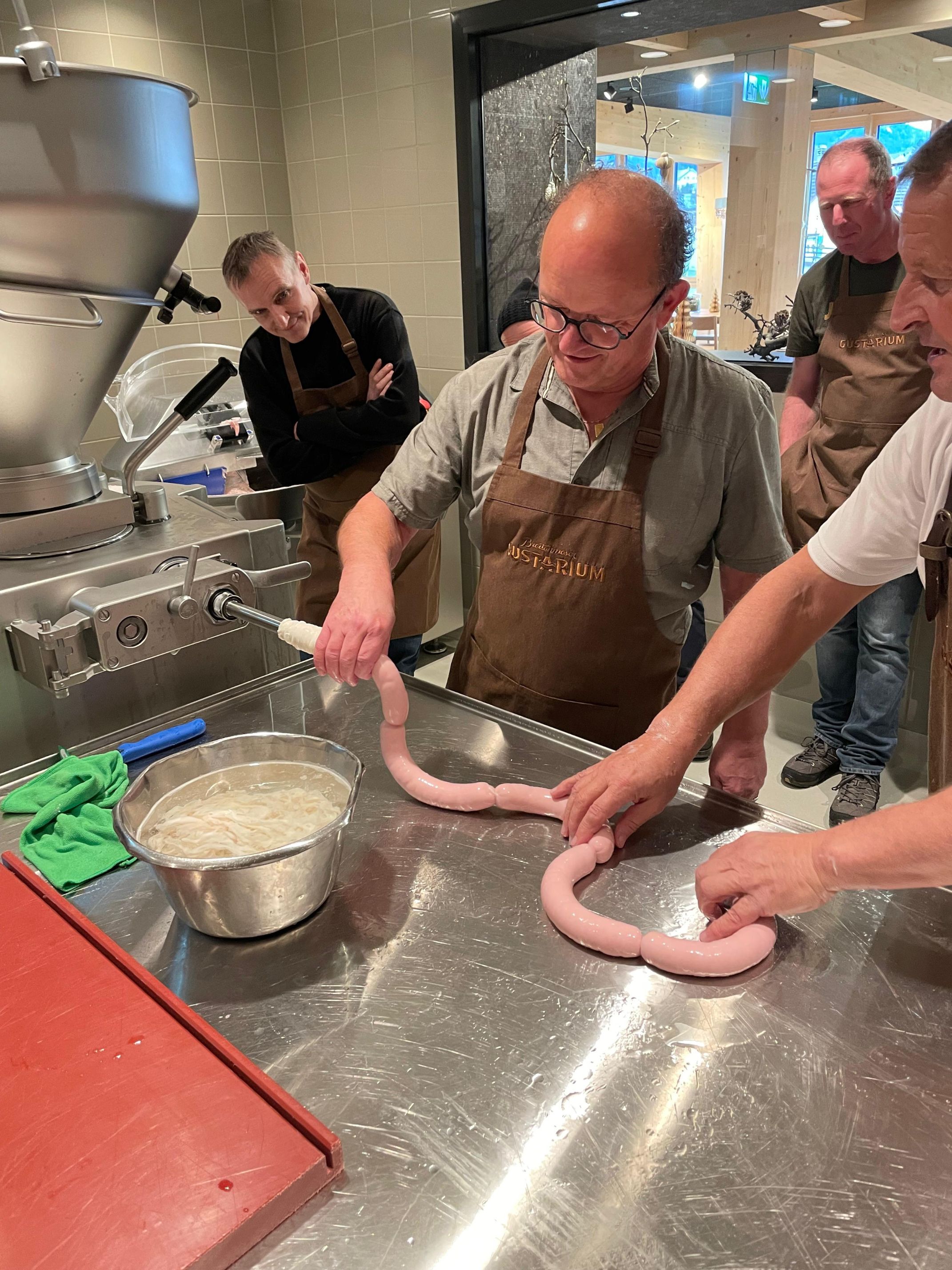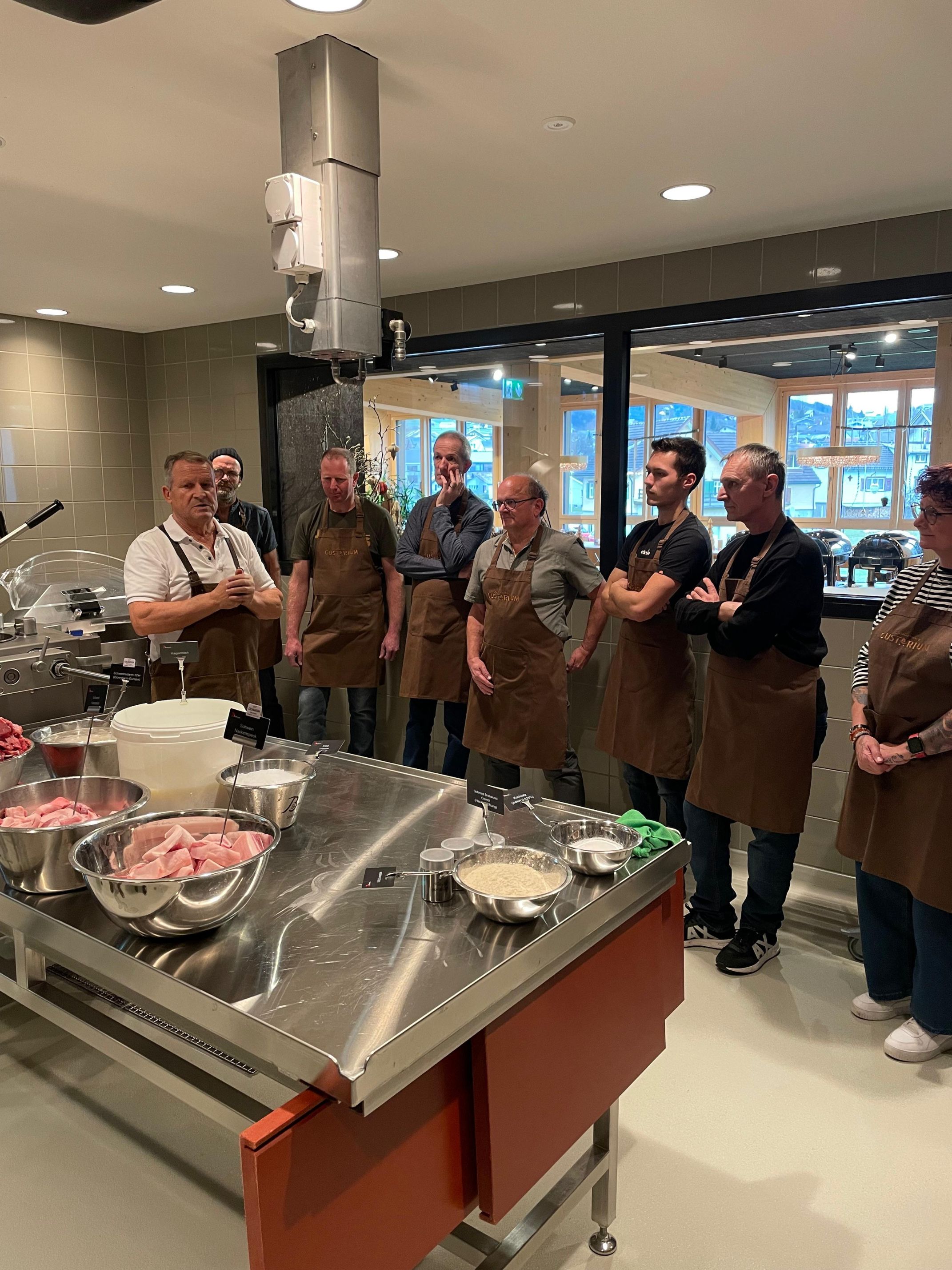 Unser diesjähriges Weihnachtsessen stand ganz im Zeichen von Genuss, Handwerk und gemeinsamen Erlebnissen. Den Auftakt machte der Besuch im Gustarium, wo wir in einem spannenden Kurzseminar in die Kunst des Wurstens eingeführt wurden. Mit viel Fachwissen und Leidenschaft erhielten wir einen Einblick in die Techniken und die Verwendung hochwertiger Zutaten.